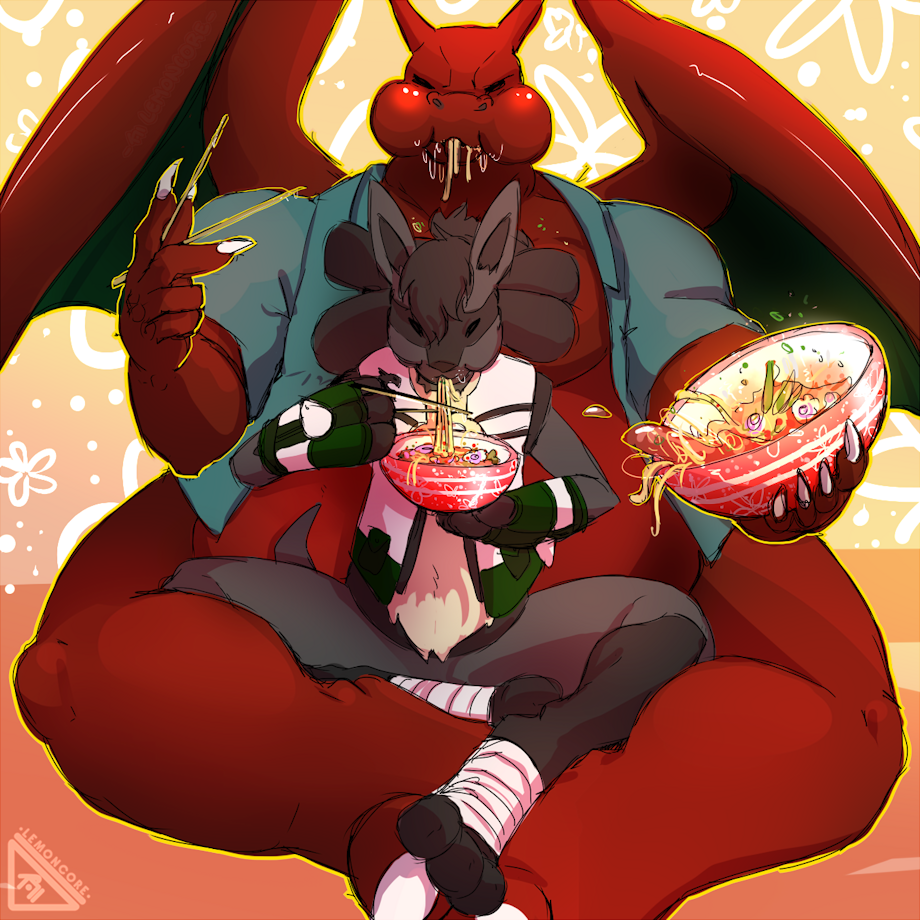 There's nothing like free food to a charizard that keeps his gut at a nice, healthy level of prominence! As such, Rogue knew that a couple bowls of ramen could pull the big fire-type from his usual daily routine to hang out with him! Rogue had been doing quite a bit of extra work as of late, exploring and charting out the wilderness and ruins nearby some of the outpost towns that relied upon the city that Charkol and he lived in. Although the free food was a big motivator to hang around for an extended period of time, Rogue's stories of the wilds was more than enough to keep his interest! Who wouldn't want entertainment and a meal at the same time?
