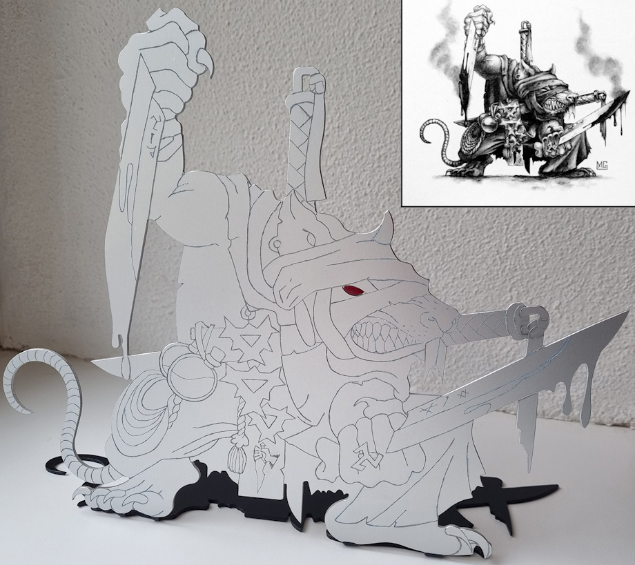 This one was tricky to make. Notice that there's very little in terms of lineart, and that trips me up when all you have to work with is lines! Despite the hardship it came together well enough, and I made it stand up by using a slightly compressed mirror image that is connected at the feet and bent backwards. It's like a shadow, but also what props it up! The person I sent this to put it on a shelf, and nothing brings a living room together like an assassin lying in wait! Stinkin' no-furs must die-die!