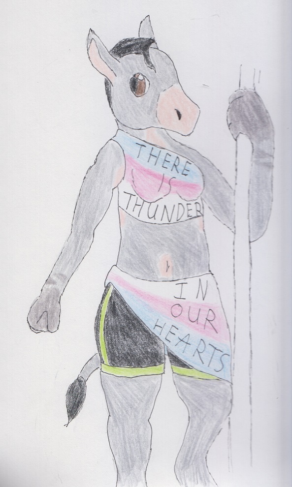 A sketch bloomed into a character. Trans donkey girl, on her way to pride