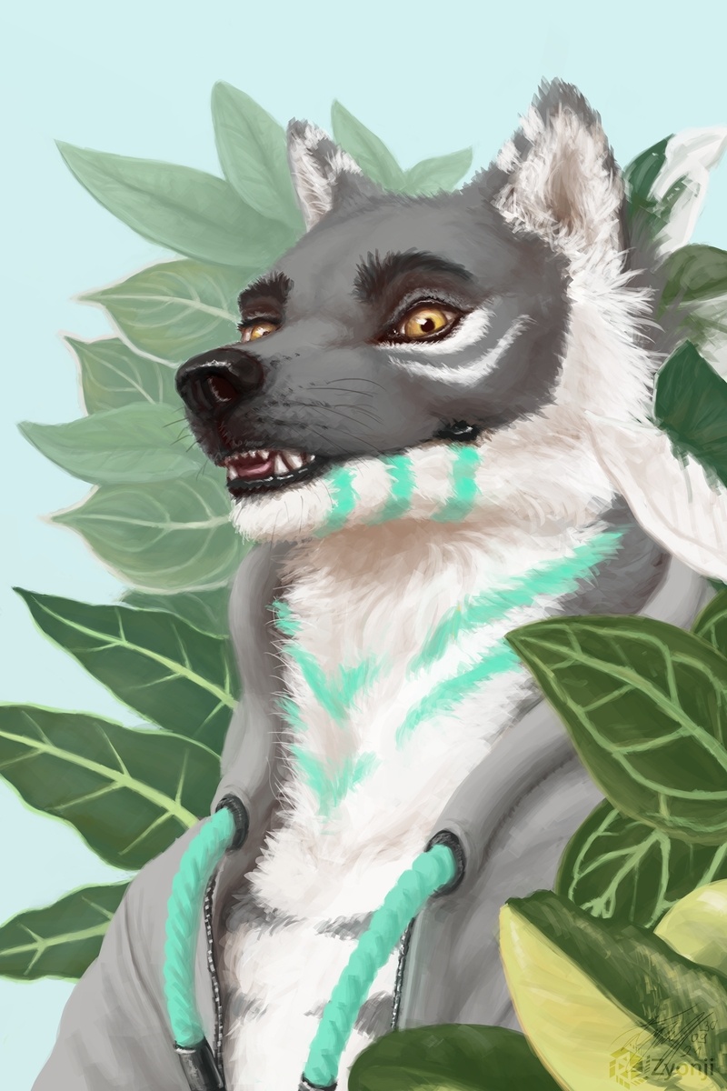 This is a portrait for Harbinger to capture his hobby of growing plants. It shows this wolf joyfully amidst samples from his treasured collection. (: