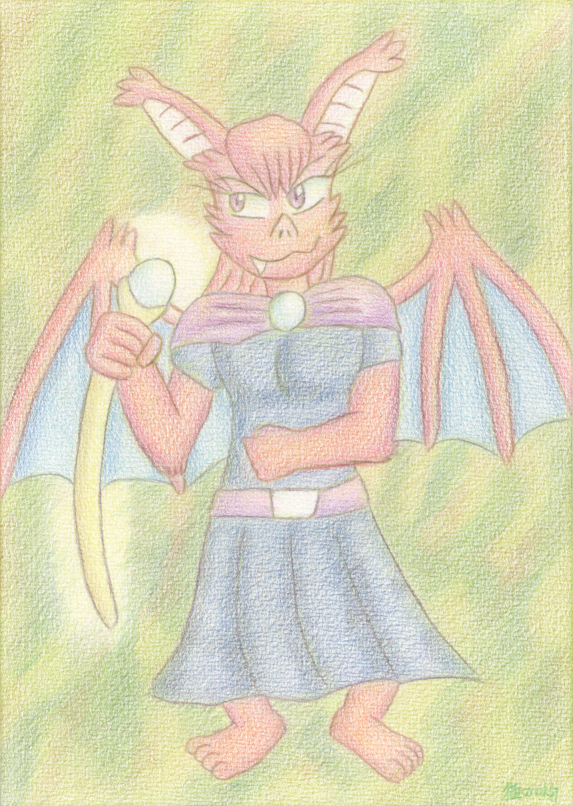 she is my bat witch character Vadima with simple green background and I draw this art in 2020. I draw on a rough paper and I feel it's a few hard to use but on this art the color become quiet and it's my favorite taste, and I love the subtle light effect around her staff.