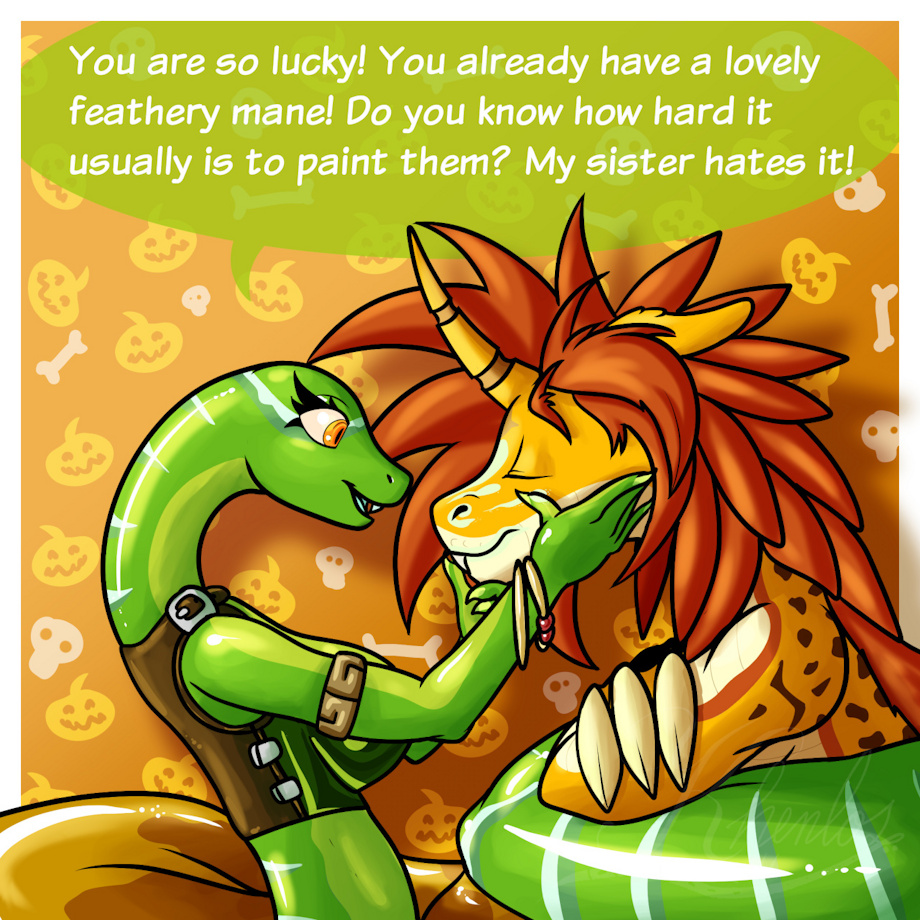 "Astra wanted to spend some time enjoying the festivities that come with this time of the year, and decided to recruit her favorite naga! Sadly, he didn't have any costumes and didn't know what to do, so she offered to teach him, and also helping him with some makeup to spook any visitors. Also, he will return the favor, since there are some places that are hard to reach, even for a naga!"