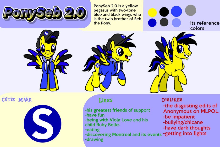 He has mild ASD He can do Sonic Rainbooms He can fly very fast He is married to Viola Love with their child Ruby Belle He has a lot of pony friends, but it's very hard to name them one by one He loves to read comics, such as Garfield, Kid Paddle or Nelson the Imp