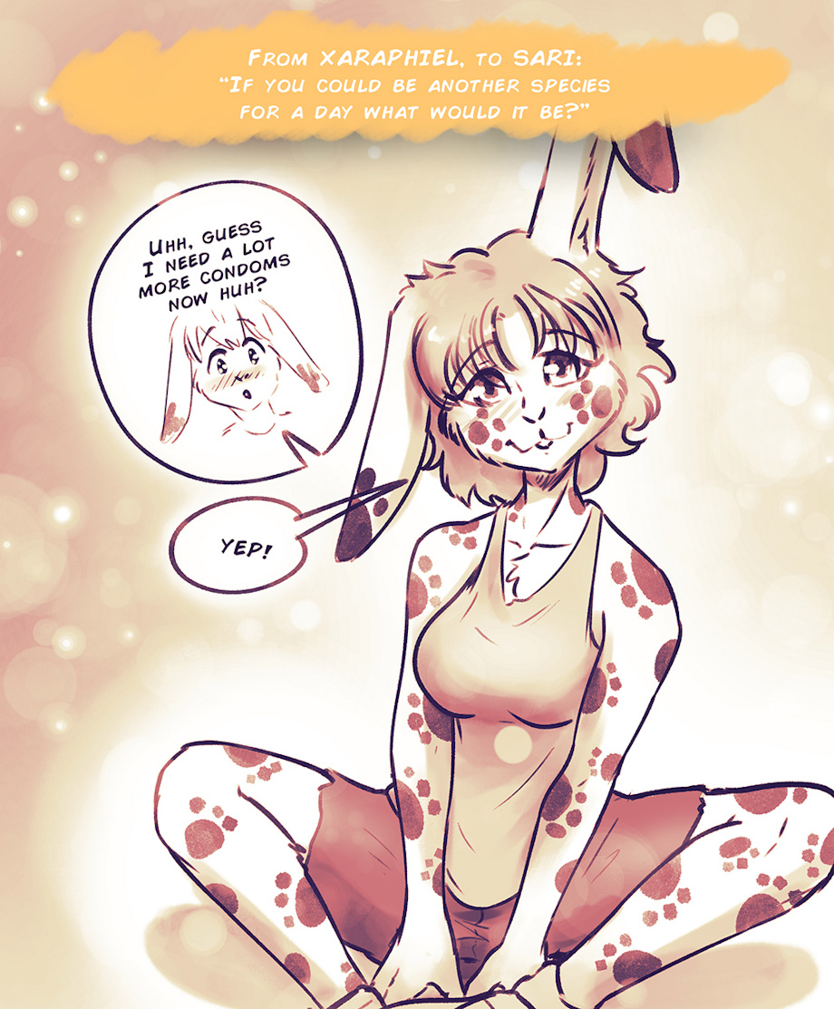 Question this week from Xaraphiel to Sarina "If you could be any other species for a day what would it be?" Sari Chooses a bunneh... looks like Darren's gonna have to buy stock in a condom manufacturer LOL!