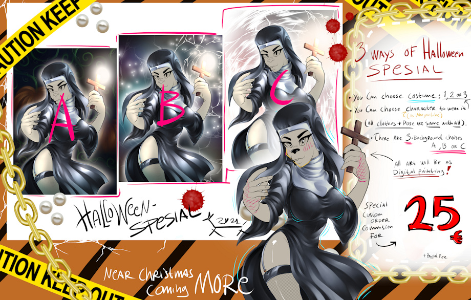 Choose your own fursona or character into one of these SEXY outfits, There are three background choices for you to chose, A- with two pumpkins behind (More digital way) B- with colorful sparkling shine or C- fast lightning as comic style. Also normal black screens are possible too if you like to have it that way!