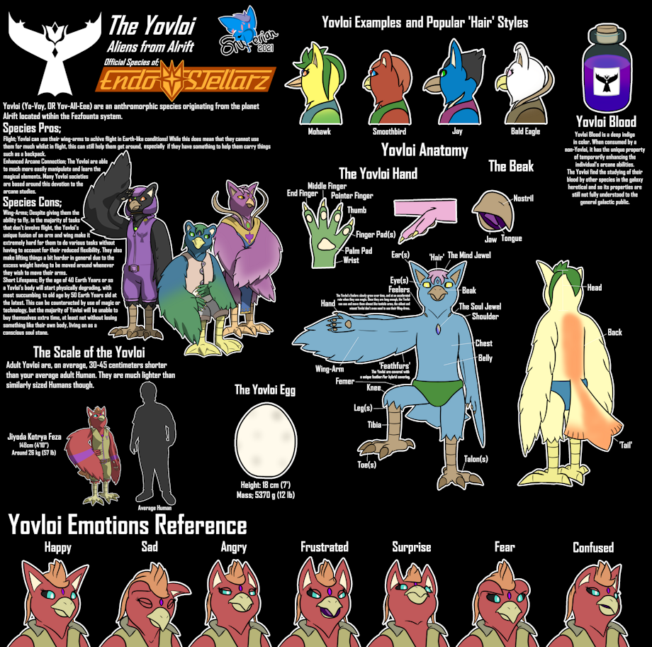 Yovloi Yovloi (Yo-Voy OR Yov-All-Eee) are an anthropomorphic species originating from the planet Alrift located within the Fezfounta system. They have two eyes, arms, ears, and legs similar to a Human, though notably their arms appear to be a mix of human arms and avian wings. Their body is covered mostly in vibrantly colored feathers and below a thin layer of similarly colored fur. Their arm wings allow them to fly, being one of only two species usually capable of flying in Earth-like conditions. (Glidori being the other flight-capable species.) They can have one of a variety of tails, most of witch are capable of assisting in flight. In their chests is a glowing gem the Yovloi claim harnesses their soul and amplifies their magical abilities. Female Yovloi have two gems unlike their single gem male counterparts, though rarely some females can have three gems! Upon their death their gem(s) grow dark and inert. Yovloi have hard skinned legs leading to talons for feet, though in rarer cases paws.