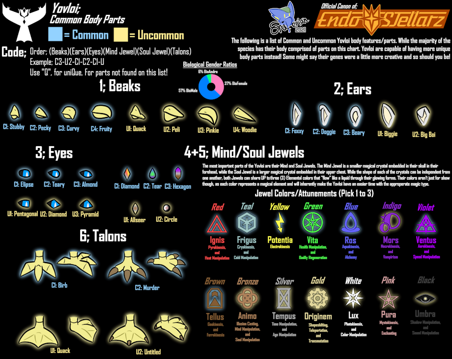 Yovloi Yovloi (Yo-Voy OR Yov-All-Eee) are an anthropomorphic species originating from the planet Alrift located within the Fezfounta system. They have two eyes, arms, ears, and legs similar to a Human, though notably their arms appear to be a mix of human arms and avian wings. Their body is covered mostly in vibrantly colored feathers and below a thin layer of similarly colored fur. Their arm wings allow them to fly, being one of only two species usually capable of flying in Earth-like conditions. (Glidori being the other flight-capable species.) They can have one of a variety of tails, most of witch are capable of assisting in flight. In their chests is a glowing gem the Yovloi claim harnesses their soul and amplifies their magical abilities. Female Yovloi have two gems unlike their single gem male counterparts, though rarely some females can have three gems! Upon their death their gem(s) grow dark and inert. Yovloi have hard skinned legs leading to talons for feet, though in rarer cases paws.