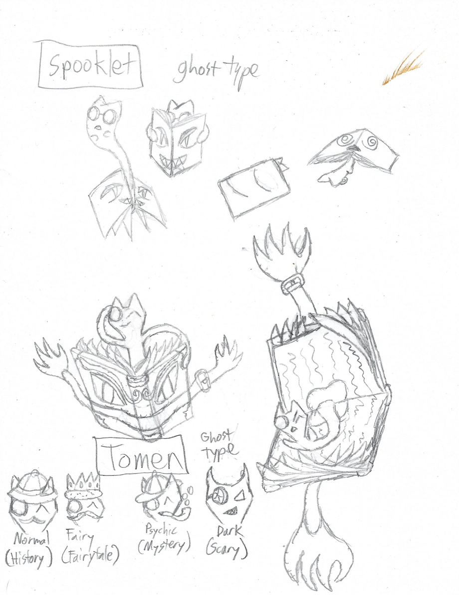 Tomen varieties arise when a Spooklet evolves while gathering a certain amount of one type of story (or, in gameplay terms, if holding the corresponding book/page when they reach the level to evolve. Or possibly as a reaction to holding certain items). This reflects as an outward appearance of Tomen's "Reader" as well as the cover of the "Book" portion of the creature. The stories these Tomen tell and their dispositions vary due to what they find most fascinating, but they all have their strengths and weaknesses. (Stats would be the same, just type differences, kinda like Oricorio). They enjoy living with writers, and will gift them ideas if they are stuck in a rut. Often, their stories will also reflect the writing style of their trainer in those cases.