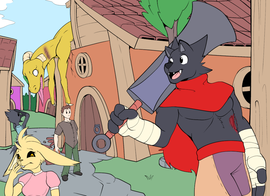 A quick strike to the neck ends the threat. The impact sends the beast flying, wrecking the roof of a villager's home. Rex doesn't pay it too much mind, Lorian will cover for it, he always does.