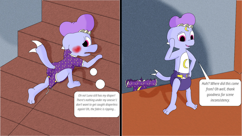 Anyway, it is a fun idea to draw. Poor Culania was getting hooked by an unknown individual, but luckily Luna’s diaper appeared on him due to the inconsistency. I’m somewhat pleased with the posing, though I’m not entirely satisfied with Culania’s anatomy. I was trying to make his body more toddler like, though it ended up looking older. This is likely due to my own impatience and my support layer mannequins. I need to do more editing. I also got confused with how to do the onesie. It doesn’t help that I was going for one of the “between the leg snaps” while Culania canonically wears one with the buttons near the waistline in front.