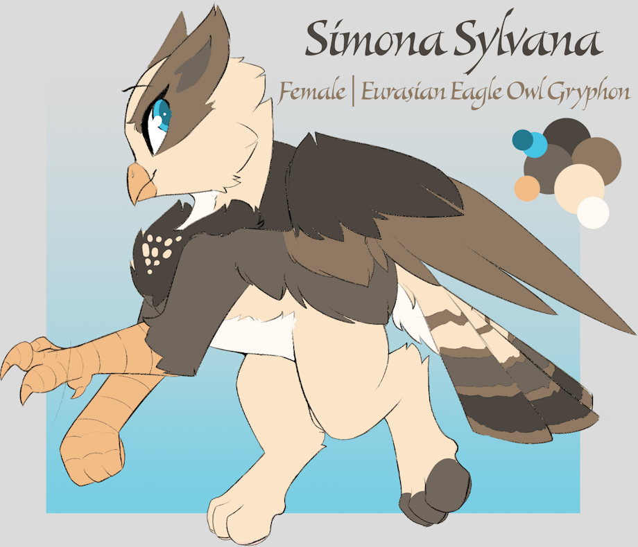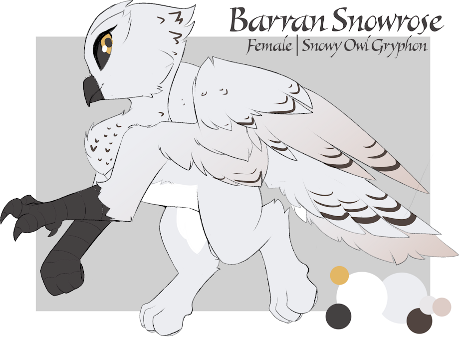 Barran Snowrose! A gryphon with a snowy owl mix in her. Naturally a bit of a leader character (Barran, the queen from Guardians of Ga’Hoole) who is also quite good at picking up any skills she comes across.