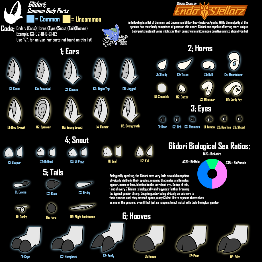 Biologically speaking, the Glidori have very little sexual dimorphism physically visible in their species, meaning that males and females appear, more or less, identical to the untrained eye. On top of this, 1 out of every 7 Glidori is biologically androgynous further breaking the typical gender binary. Despite gender being virtually an unknown to their species until they entered space, many Glidori like to express themselves as one of the genders, even if that just so happens to not match with their biological gender.