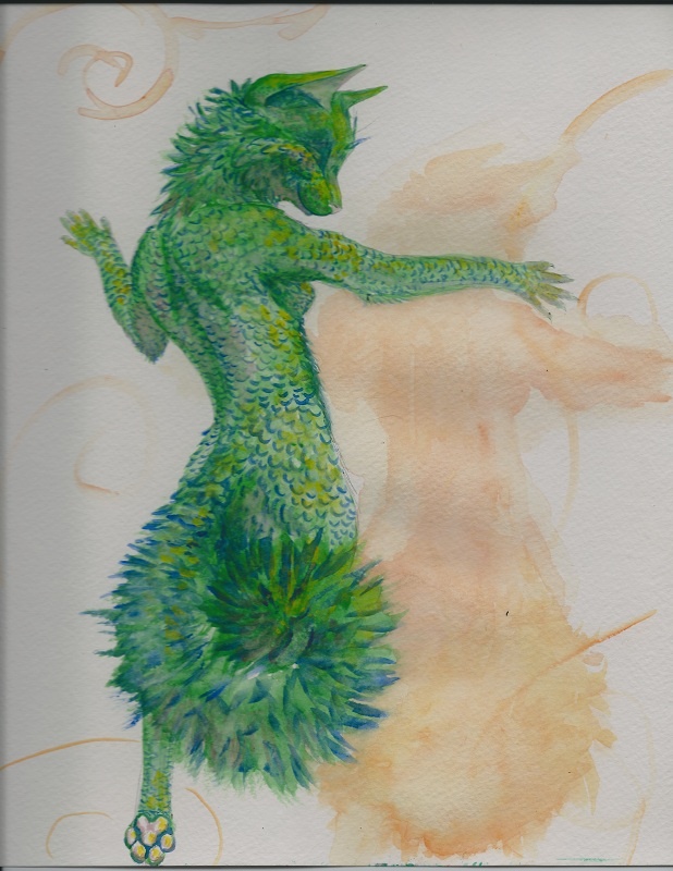 This is my new fursona! I have decided (uncreatively) to call her Feathercat. She is an iridescent green feathered cat woman (in case you couldn't tell). She is painted in watercolor on 9x11" Strathmore paper over a ballpoint pen sketch. I used rose and yellow paint washes for the lighting on her body, and I am really pleased with her.