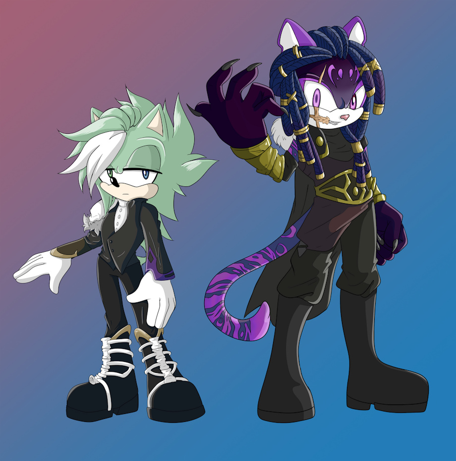 Decay looks like his ancestor except for different fur colors and he was the first necromancer of his bloodline. the big cat next to Teja is Kian and they're both lovers. they both died after being betrayed by someone they trusted and now spend their time haunting Decay as ghosts which he's cool with.