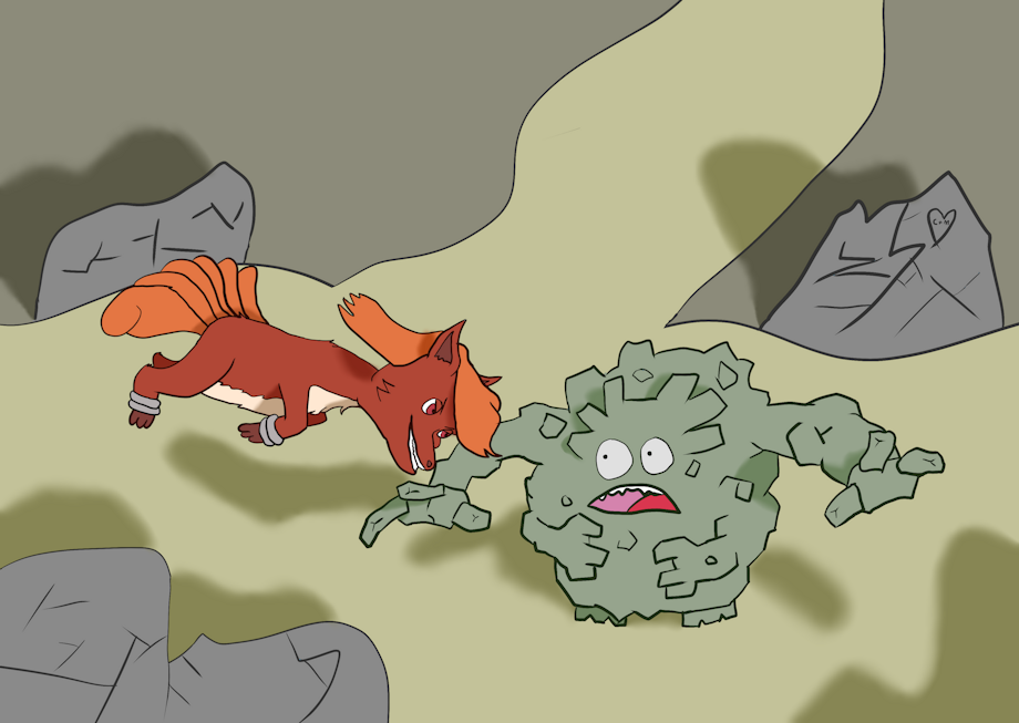Though when he finally saw a sparkle of light down a slope, he decided to happily slide down the slope, all the way into a big, and what felt as lighter than it looked boulder, in which he knocked over with a grunt. When he recovered from his collide, not expecting to move the rock, he looked over to see a big and angry Graveler who glared at the small fox in front of him. “I’m sorry, I didn’t know you were there.” Flare said, looking apologetic, and was trying to flash his badge that he put on one of his hind tails before he squeaked and jumped out of the way of a flung boulder that the rock type threw.