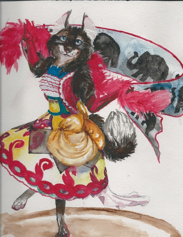 This is another watercolor on 9x12" Strathmore. This took me several hours to complete. I made a ballpoint pen sketch of the cat and her dress, and painted over this. The reds in her dress were achieved with lots of layering. The black diamonds are made with a light black wash. Her gloves are done in shades of red, with green to accent their shininess. She is designed primarily to be a demo, but she is up for auction at FurBuy! If you want her, bid here: