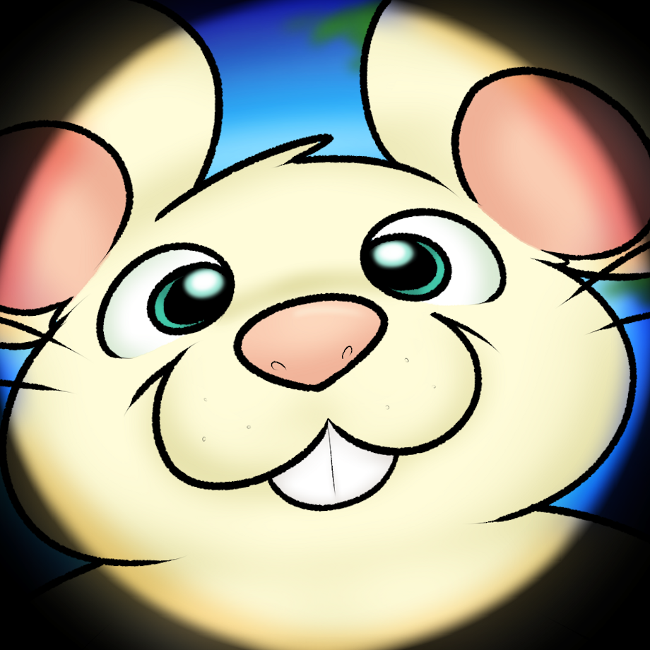 Just a color drawing of Oxnard with the fish eye lens affect - that means his snout is up close, enlarged, and zoomed in, awhile his cheeks and eyes are all stretched out and fat and wide. It looks very goofy. Everything's only visible within a circle and the rest is just black.