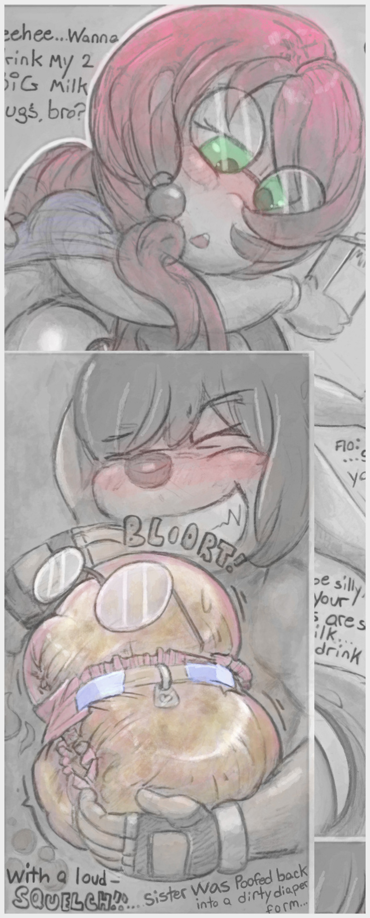 ;>n> it doesn't work...he didn't let her reform to hear her silly jokes, besides she stinks and loaded her own diaper pretty bad. >w< So he picks her up, like a large bottle and sucks his sister's tits til his tummy's full, then after he's had his fill, and no longer has any use for her, he TFs her back into her diaper form. >:3c
