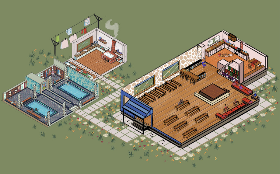 Detail of the Katta Tail's Inn's ground floor, with detached bathhouse and washroom. Inspired by Quest for Glory II.