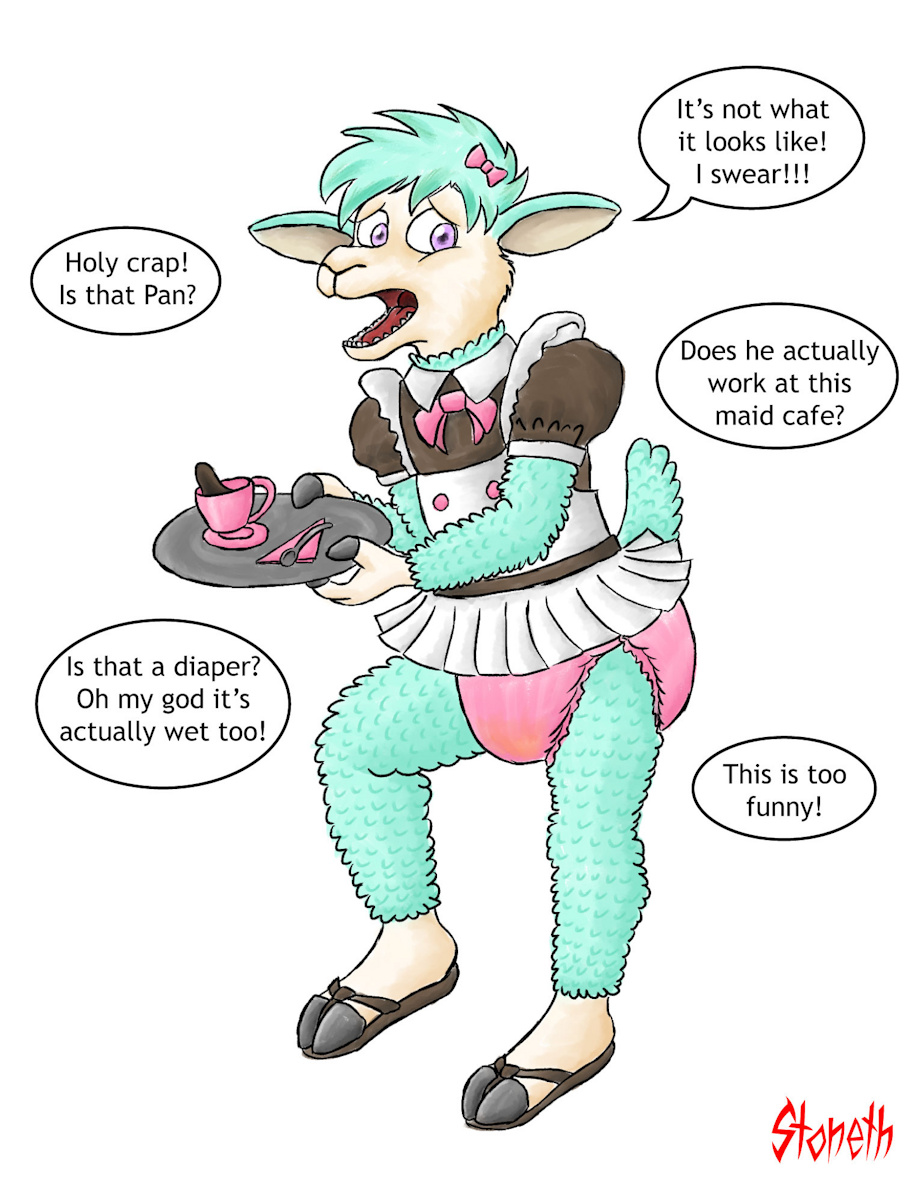 My half of an art trade with Benihime Shido of their sheep boy character Pan. They asked me to draw him in an embarrassing situation, so I decided to make him the newest hire of a maid cafe, a position he no doubt wanted to keep a secret from his peers ... for good reason!