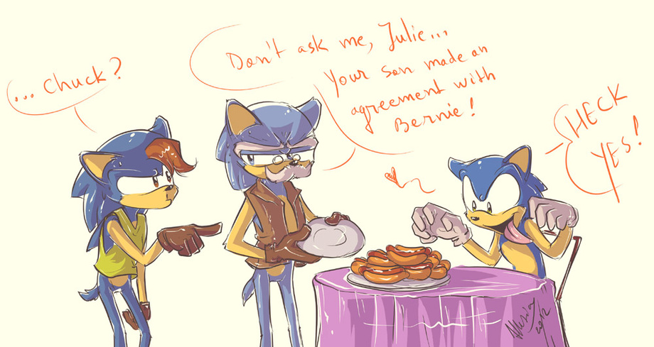 Great, but it IS bad luck not to have a cake for your birthday...candles or not. How about a large cake in the shape of a chili dog? I bet the Cake Boss could make Sonic an epic one for his 21st. *hee* Love the way you draw, very cool. :D