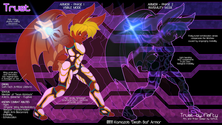 Commission for Flafty of OC Trust featuring a custom armor design and description of his powers.