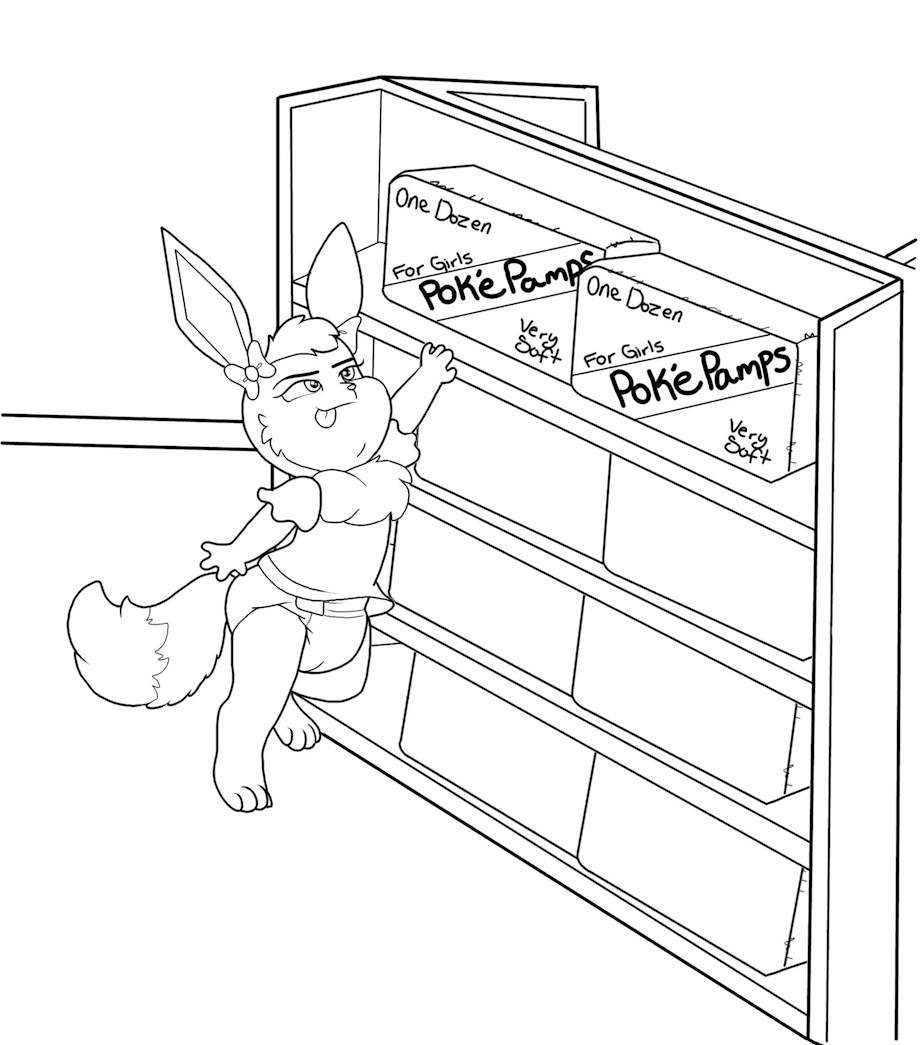 P2: But she might've drank too many sodas on her way so, her bladder's been forced out in her diaper as she's trying to reach for the diaper packages up on the shelf. Let's hope there's a bathroom nearby so she can change herself immediately before her diaper leaks.