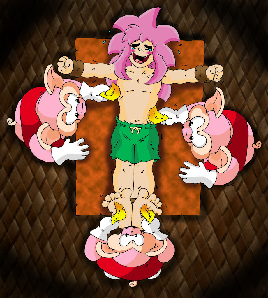 '...After losing his last life and failing to protect the Dwarf Village, the Koma Pigs decided to use one of the dwarf's homes to house the young feral boy, tying him down onto one of the tables. When Tomba awoke, he saw a light pointing right at him, but upon further inspection, he hears the snorting of pig noses! 3 Koma Pigs drew feathers and started to go to town on Tomba's bound, vulnerable body. They used those feathers to go up and down Tomba's sides (even in his pits!) while the other tickled the toes and soles of his captive's feet, getting the occasional floss in between Tomba's toes too! The boy laughed in hysterics; Only the Player had the power to stop this by simply pressing continue!...'