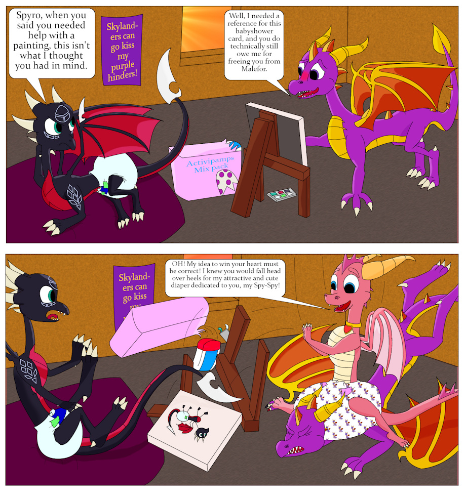 Yeah, Spyro wanted to make a Baby shower greeting card, but needed Cynder’s body, as well as another thing, in order to properly paint it. It is also around this time where Ember decides to employ the plan that involved the Spyro print diapers. Is it successful? Well it looks like she broke Spyro’s neck so I’d say no.