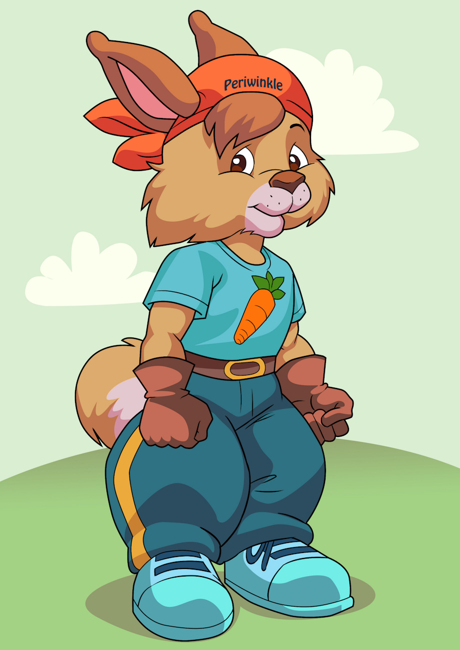 This is the rabbit boy Periwinkle Bellflower, a character from the Bellflower Bunnies. I've kindly commissioned an DeviantArt artist named Art-2u to do a picture of his outfit I've designed for a soon-to-be project featuring that male character, along with his siblings, his friends and new characters for this project. Periwinkle's outfit in this picture consists of a vermilion bandana, a cerulean blue T-shirt, brown miner gloves, blue green pants with golden lining, a brown belt around the waist with a gold buckle, and light blue sneakers with navy blue laces and lining and teal soles. Periwinkle is also known to be an extremely popular character in the Bellflower Bunnies series, and he first appeared in "Periwinkle and the Full Moon Ball". Ever since that book along with another book called "Family Moving Day" featuring him was made and published across the world, Periwinkle became a fan favourite to many Bellflower Bunnies fans across both North America and Europe.