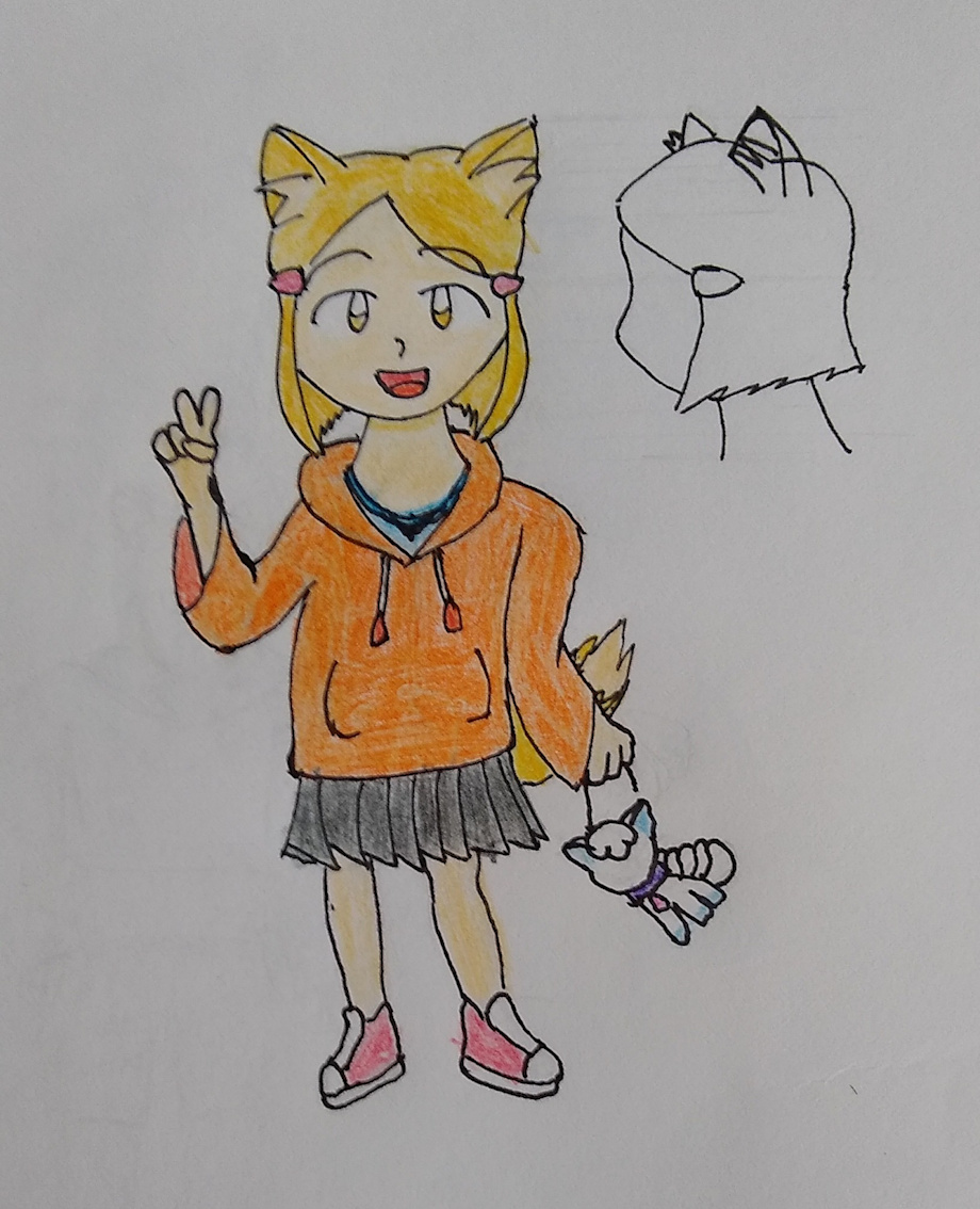 My first concept drawing of Reily. Her later designs all reference back to this despite changing species. Thios version is a fox, the final is an Eevee. I drew this one myselfa few years back.
