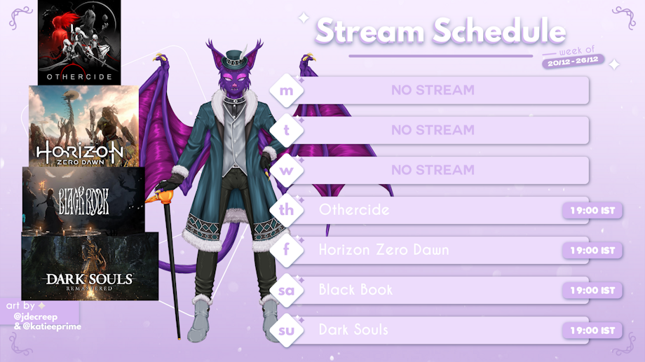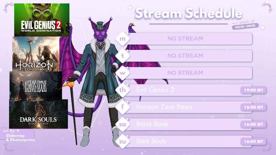 Here's my stream schedule for the week. Getting new minions in Evil Genius 2, learning about our momma in Horizon Zero Dawn, saving some people in Black Book & exploring Anor Londo in Dark Souls.