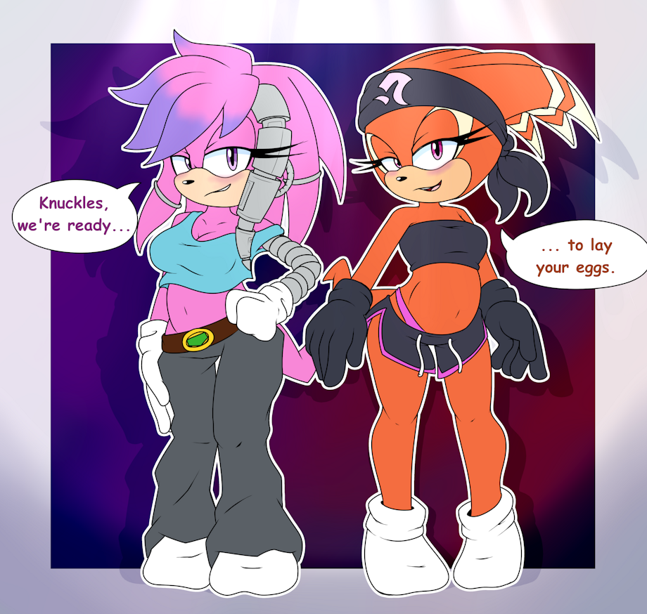 Hehehe. The Echidna Biology, even they in the past modified themselves by using genetics they keeps some stuff as laying eggs. By normal mobian mammals standards, they are would be as the end of the first trimester of pregnancy and both are ready to lay the eggs.