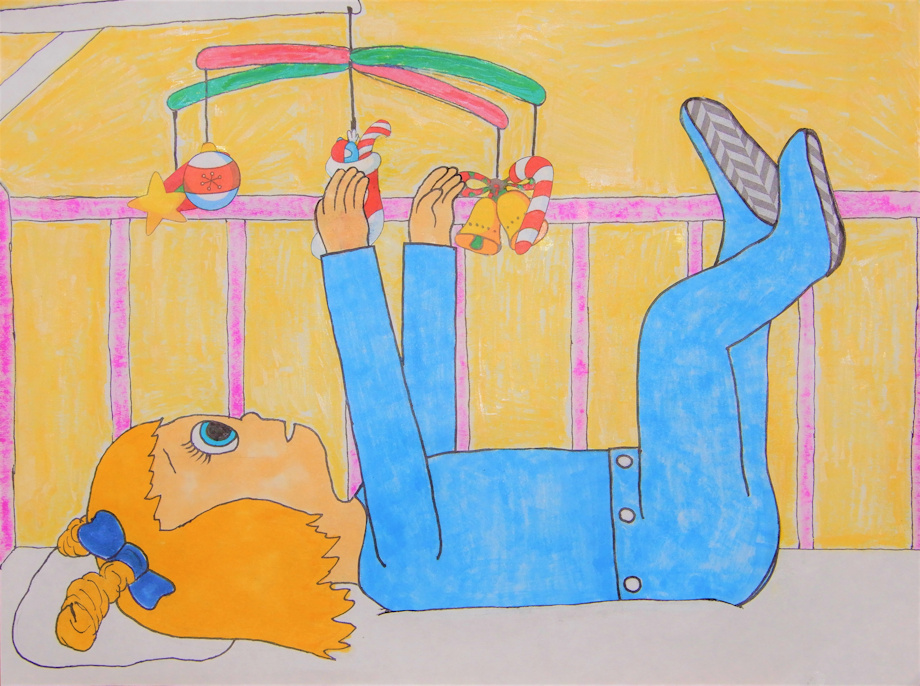 It's Cindy Lou Who (who is no more than 2) from How the Grinch Stole Christmas as a baby in her crib. Since it's the Christmas season, I decided to give her mobile the appropriate theme.