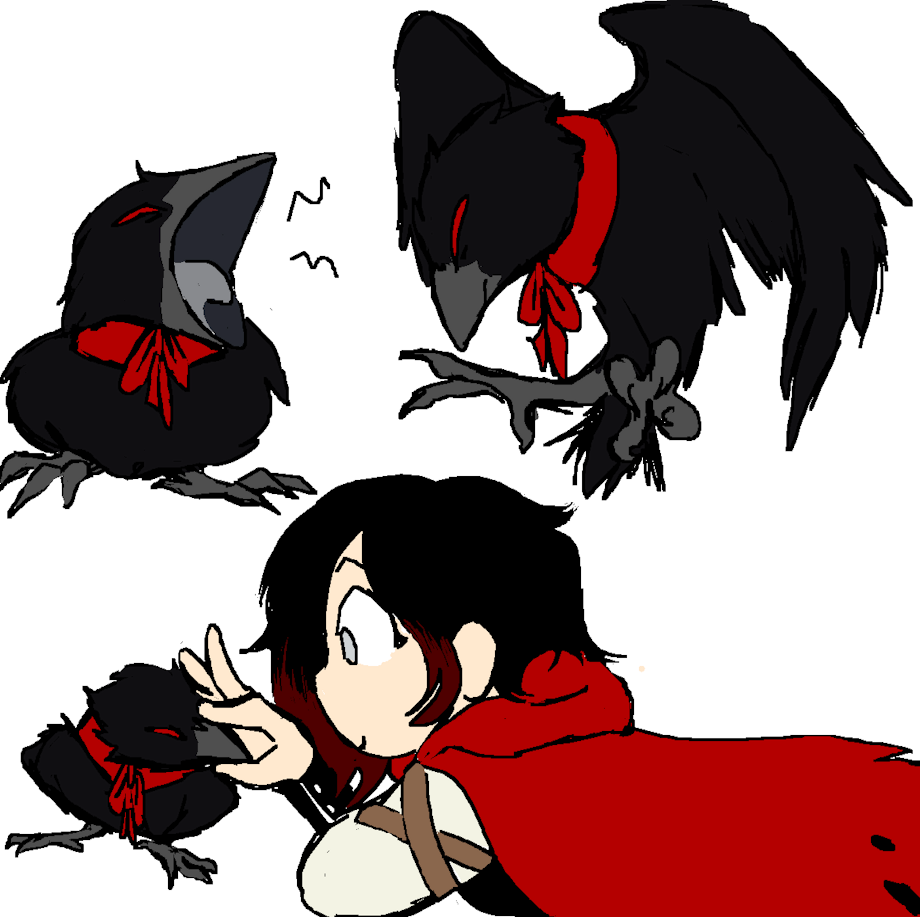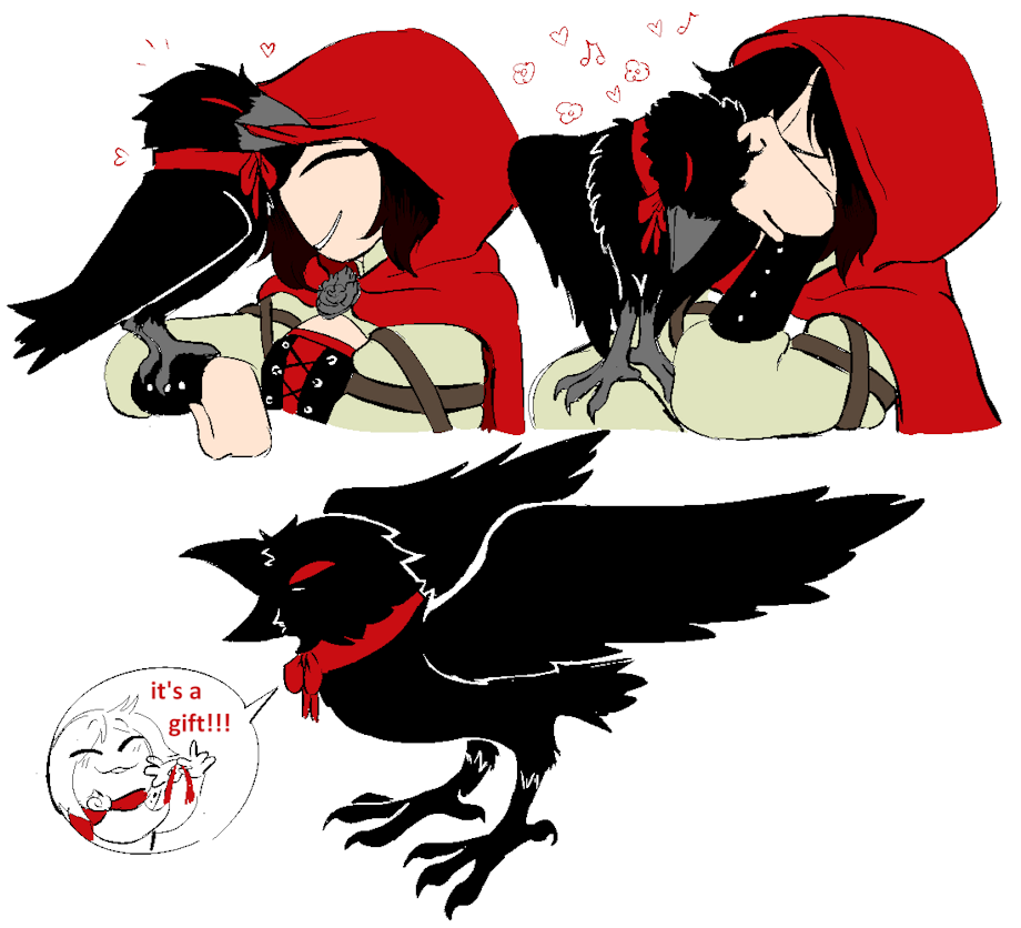 besides that, i wanted to draw ruby interacting playfully with him, like this. i think it's something that he could show her privately and then, ruby's simple nature makes her very dazzled and intrigued by him. since his crow form is for spy purposes, it means it is mostly something he uses for utilitarian reasons -- which, is why i'd love for him to actually get to be touched and handled like this. it'd be really novel and new and unique! he already has a playful side with ruby, so i imagine he would take to eventually pecking her fingers, grasping her, clambering onto her clothes, playing with her hair, etc. even tucking into her hood, or being thrown into the air by her, or catching things she throws at him, and so on! They could really learn to read each other's movements and become in sync.