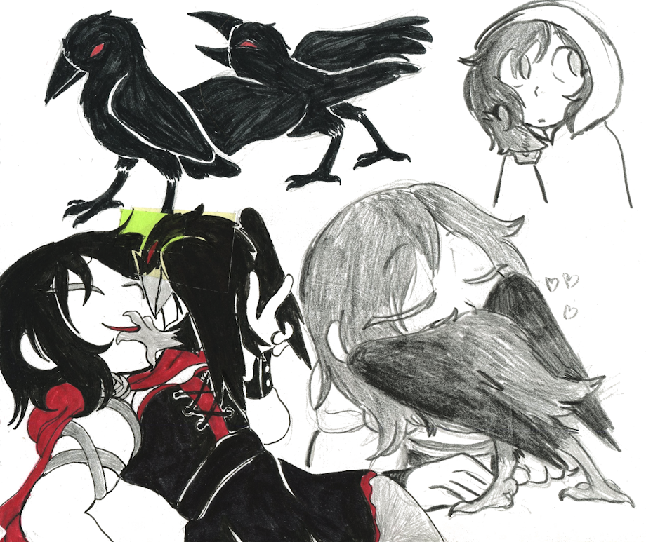 besides that, i wanted to draw ruby interacting playfully with him, like this. i think it's something that he could show her privately and then, ruby's simple nature makes her very dazzled and intrigued by him. since his crow form is for spy purposes, it means it is mostly something he uses for utilitarian reasons -- which, is why i'd love for him to actually get to be touched and handled like this. it'd be really novel and new and unique! he already has a playful side with ruby, so i imagine he would take to eventually pecking her fingers, grasping her, clambering onto her clothes, playing with her hair, etc. even tucking into her hood, or being thrown into the air by her, or catching things she throws at him, and so on! They could really learn to read each other's movements and become in sync.
