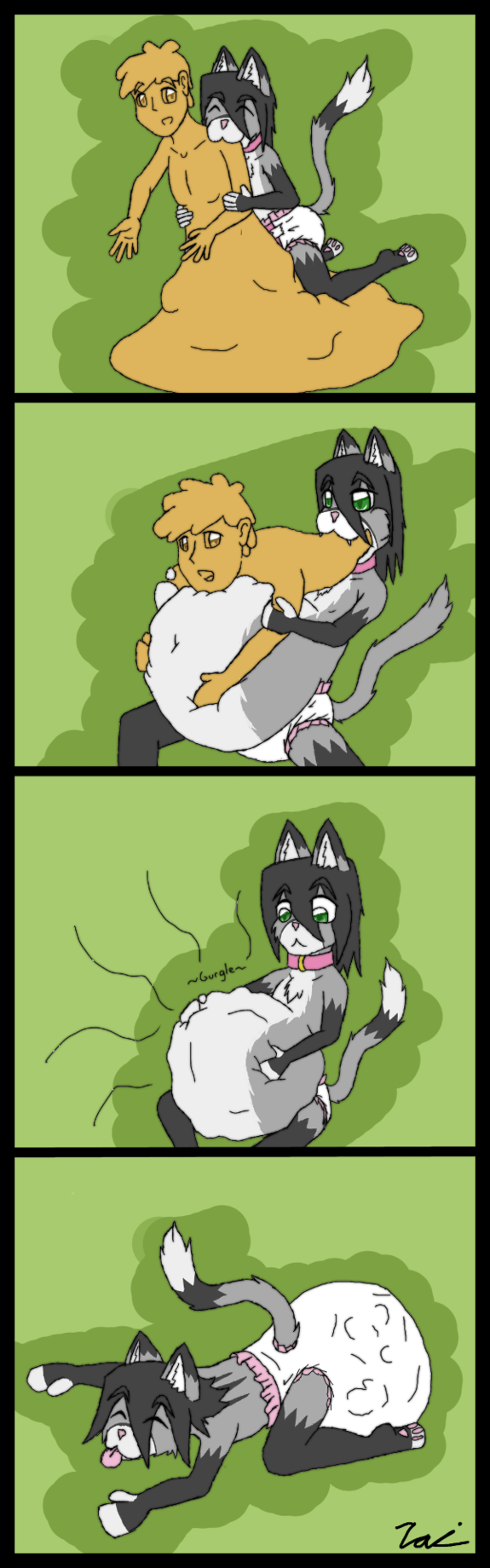 Zai was giving his friend Chris a hello glomp and nibble, but really liked his orangy taste, so decided it would be a good idea to eat him. Being a gel creature, Chris isn't much effected by the digestive system and, to much dismay, is conscious from going down the throat to filling that diaper :3