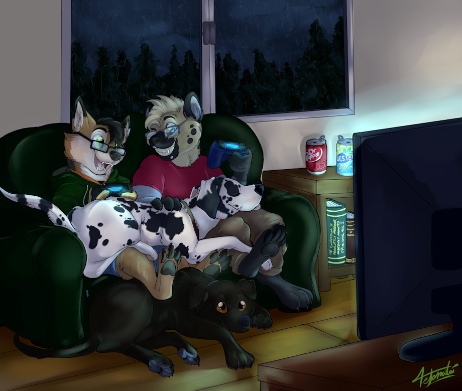 This amazing piece was done by duskwing over on FA of myself and my partner kelbalrai1990 and our two dogs enjoying a night of video games and relaxing on the couch. Was done months ago, just only now getting to uploading it here.