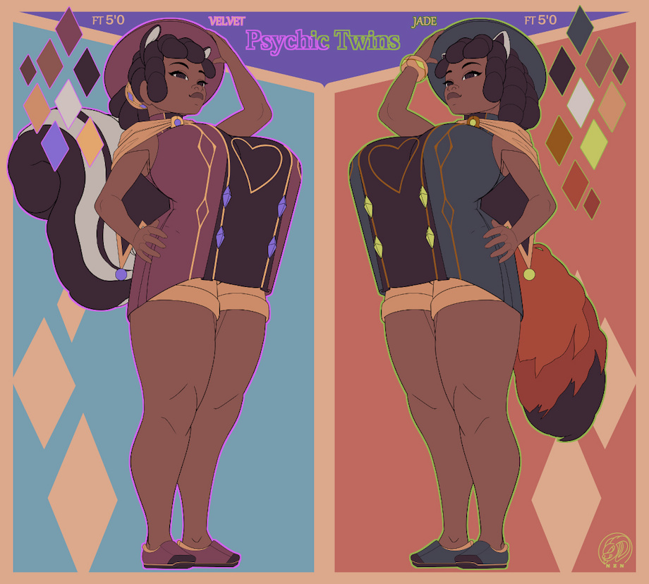 First, I got the idea from pokemon. When you're traveling and you see these twins with psychic pokemon battle you. With these two, they can use telekinesis. Names: Velvet (Left) & Jade (Right)