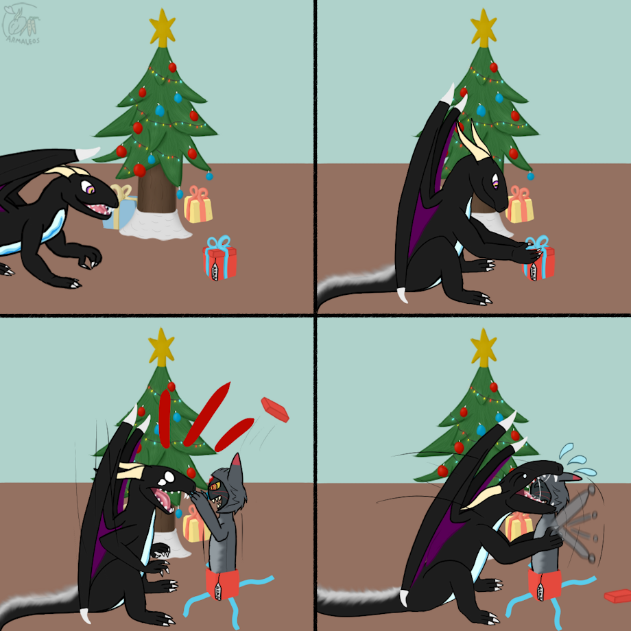 Ansel is always up to do some little tricks on people! This time, he wanted to scare Arma with a fake gift under the Christmas tree, but he most likely forgot Arma tend to try and eat the things that spooks him too much! Thankfully they are too big, but Arma still nomfed the Impim head in his panic!