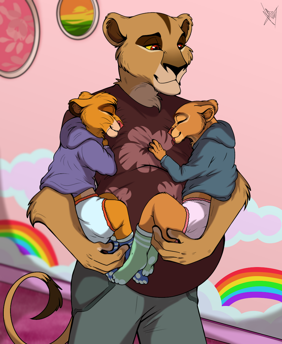 "In an alternate reality, Simba and Nala are Sarafina's cubs, both are tiny tots, and Zira is their aunt, and she's currently pregnant with Kovu and Vitani. Zira is carrying her napping niece and nephew to their nursery she has set up in her house for when they visit. She had recently expanded it, since she had two little ones of her own on the way. She knows the two in her tummy will be as rambunctious as their cousins, which will be adorable. Were you not familiar with Sarafina and Zira, you would almost mistaken Zira for being their mother as well, with how much she loves and cares for her niece and nephew. Granted, Zira has had the thought of how big her belly would be with quadruplets inside her, but she would never want to rob her sister of her cubs. Being their Godmother was reward enough for her. And she would ensure that loon of a relation Scar would never get anywhere near her neice and nephew or her own cubs."
