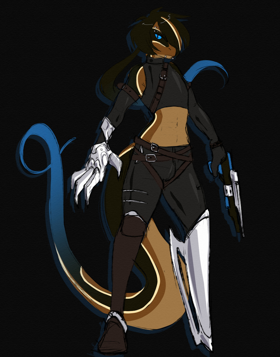 Edgy skink boy who shows tummy and also one of his legs is a blade and he's got big-ass claw bracers AND a fantasy gun that most likely wouldn't work irl!