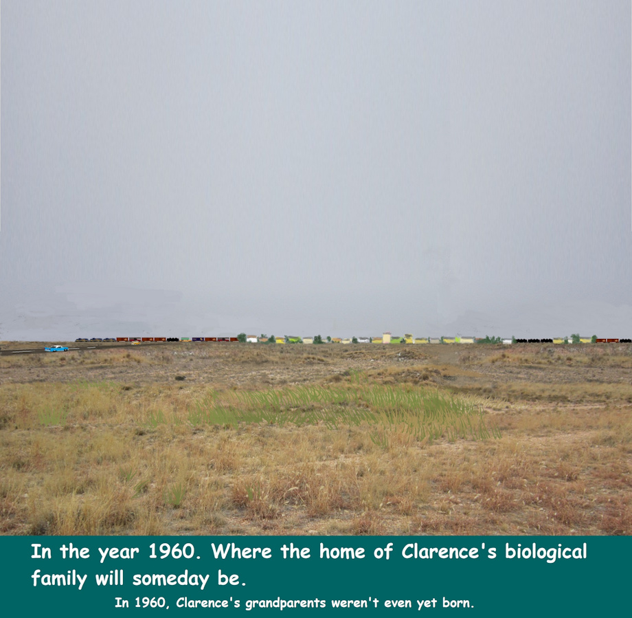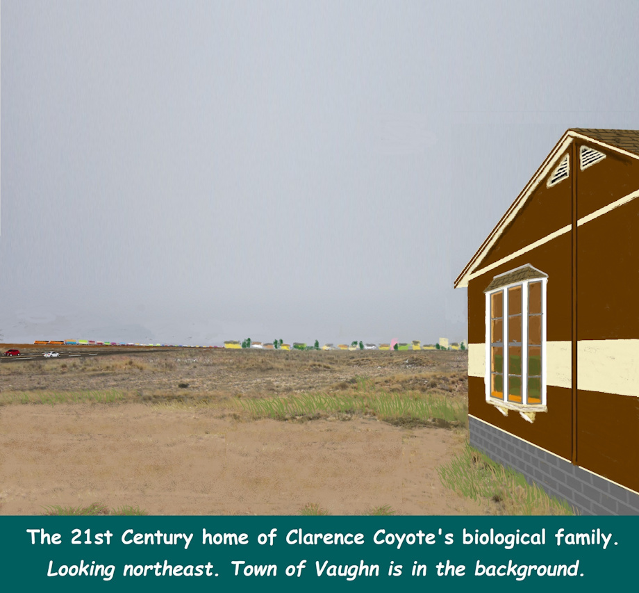 In pic # 1: This is the double-wide in the 21st Century where Clarence's birth family live; parents Charley and Alice, and older siblings Jack and Rhonda. The home is a mile or two southwest of the town of Vaughn. In the background a BNSF train is traveling along the fly-over which is a built up grade overpass where the BNSF Railroad passes above the Union Pacific Railroad (that particular UP line formally being a Southern Pacific line until UP bought out SP a few decades ago). https://youtu.be/1bCAqIPO5Kw?t=134