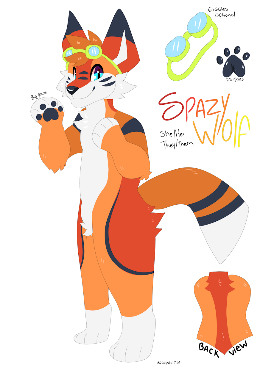 Official Spazywolf reference sheet of my character that I identify as. Took me years to come up with a color palette that I really wanted and I've finally settled, so happy ;w;