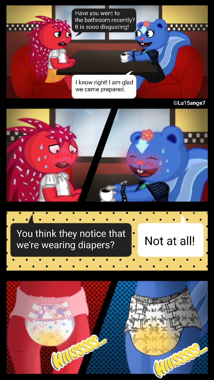 Both chatting about something un unusual while they are drinking coffee, I'm glad they both feel safe and secure, as public restrooms turn out to be somewhat dirty.