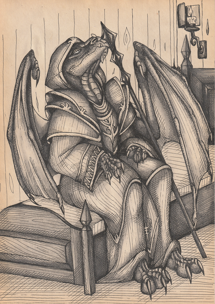 An amaziingly detailed sketch by 1phoenix1 of the very first D&D charcter I ever created, a Dragonborn Sorcerer named Myastan Balasar. The prompt I gave him was Balasar recovering after having just gained the ability to grow wings. There is a slight deviation from the scene I wrote, and pic, but no matter :P
