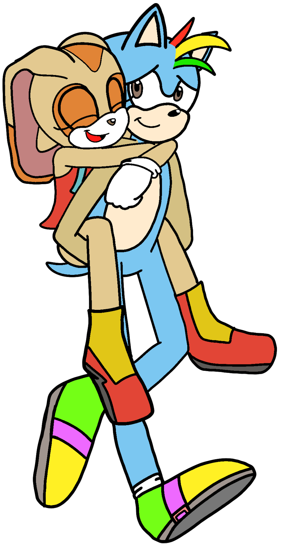 . Here we see Shield Wing the Hedgehog carrying Cream the Rabbit on his back to save her from some danger.