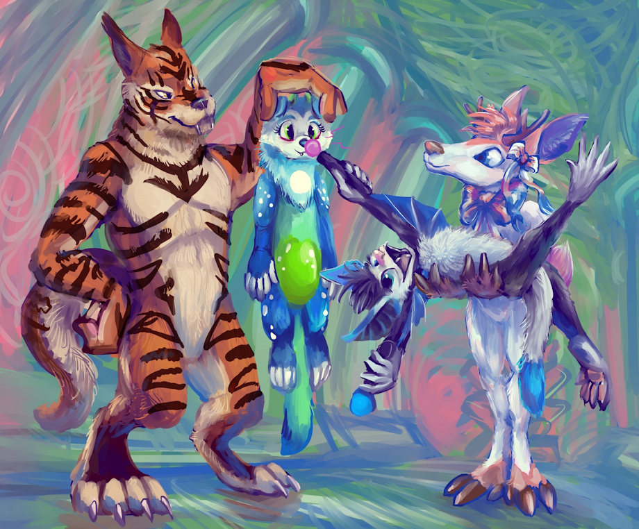 a commission drawing of a strange exhibition of mustelid-type creatures, for