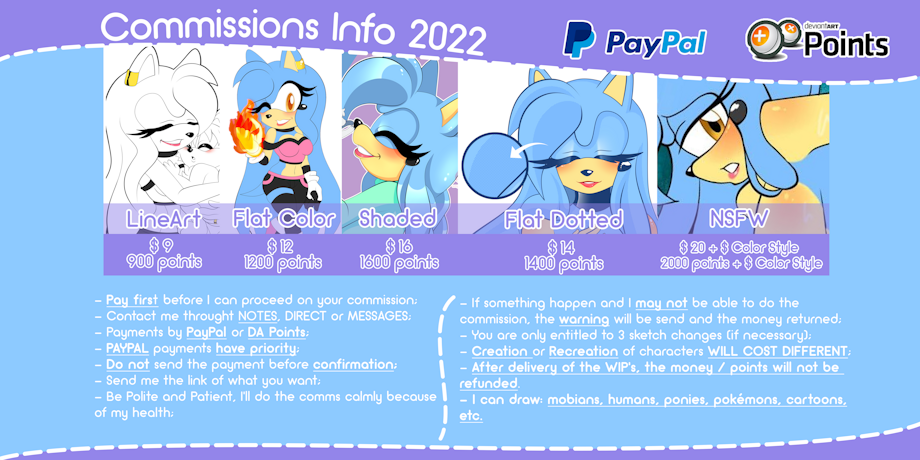 - Pay first before I can proceed on your commission; - Contact me throught NOTES, DIRECT or MESSAGES; - Payments by PayPal or DA Points; - PAYPAL payments have priority; - Do not send the payment before confirmation; - Send me the link of what you want; - Be Polite and Patient, I'll do the comms calmly because of my health; - If something happen and I may not be able to do the commission, the warning will be send and the money returned; - You are only entitled to 3 sketch changes (if necessary); - Creation or Recreation of characters WILL COST DIFFERENT; - After delivery of the WIP's, the money / points will not be refunded; - I can draw: mobians, humans, ponies, pokémons, cartoons, etc.