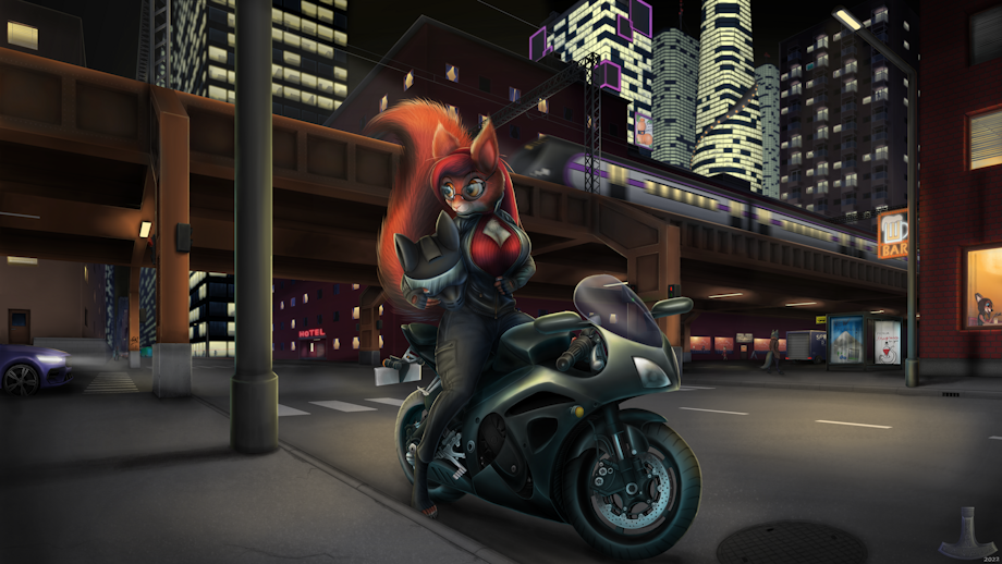 I can't belive I finally finished this. At the start I just had an idea to draw a squirrel girl on a motorbike. Then I added more and more detail until this became insanely time consuming and complicated artwork. I don't even know how many hours I spend on this.
